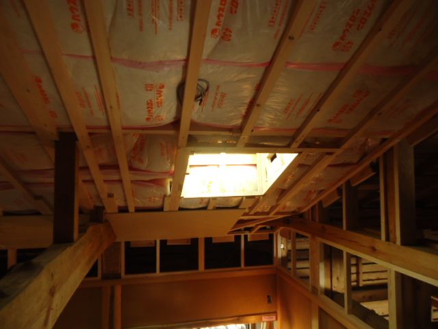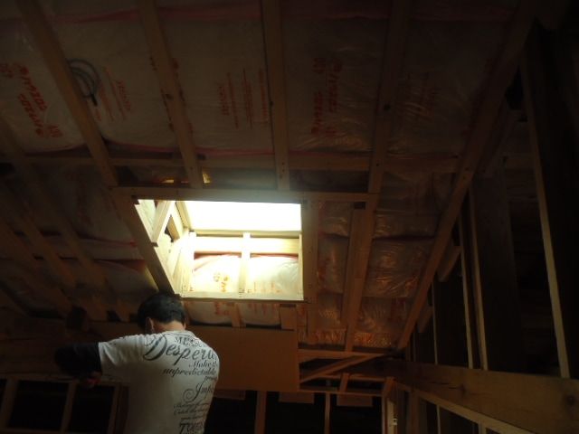 そして大工さんの出番。天井面には北側ということもあり、天窓が付けられます。明るさの効果は抜群です。