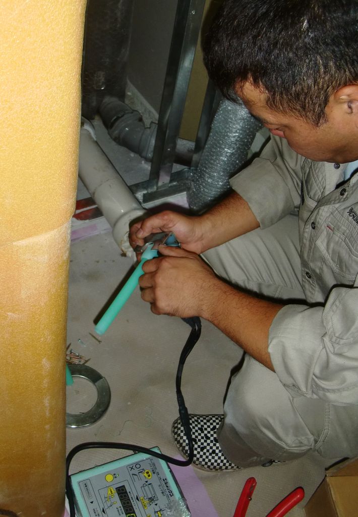 少し照れ屋の設備屋さん。(←給水・給湯管を電気融着にて接続中。)