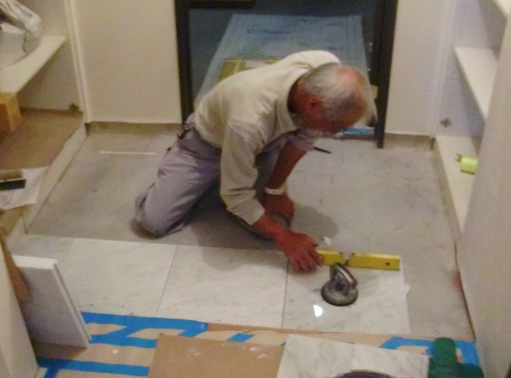 ジッと1点を見つめ考える大工さん。(←壁面の間接照明のアゴの納まりを考えています。)