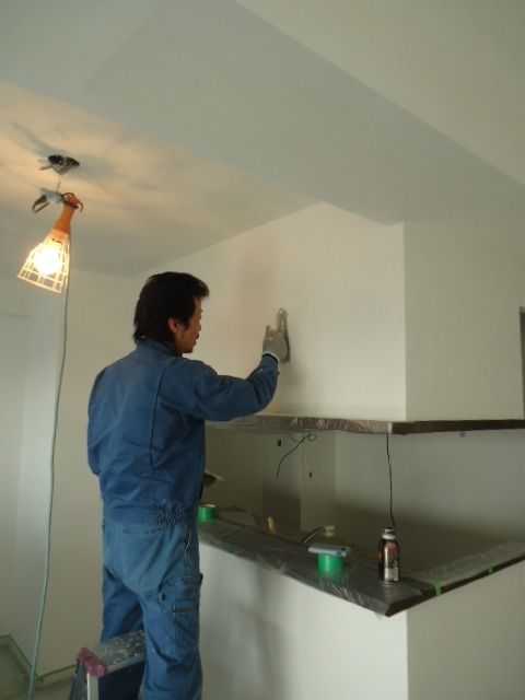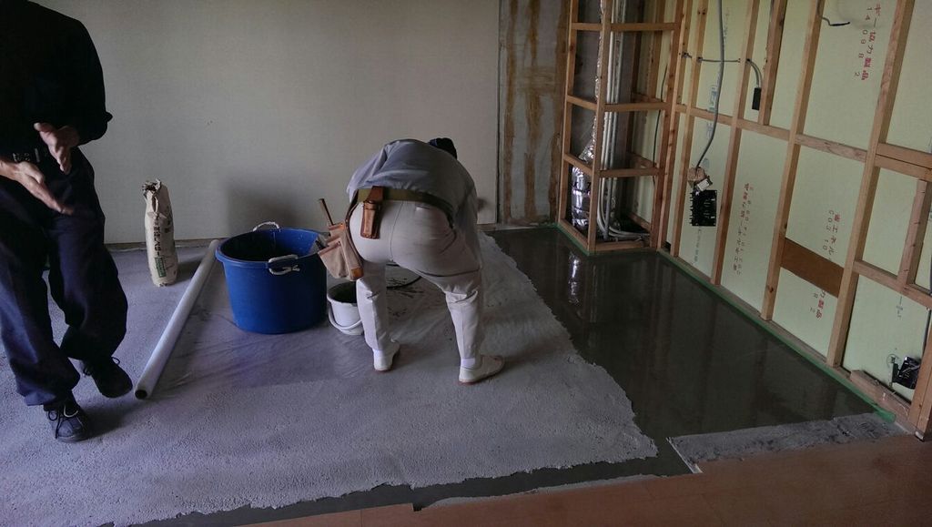 和室の床の下は均しモルタルが不十分なため、セルフレベリング材を流して平滑にします。