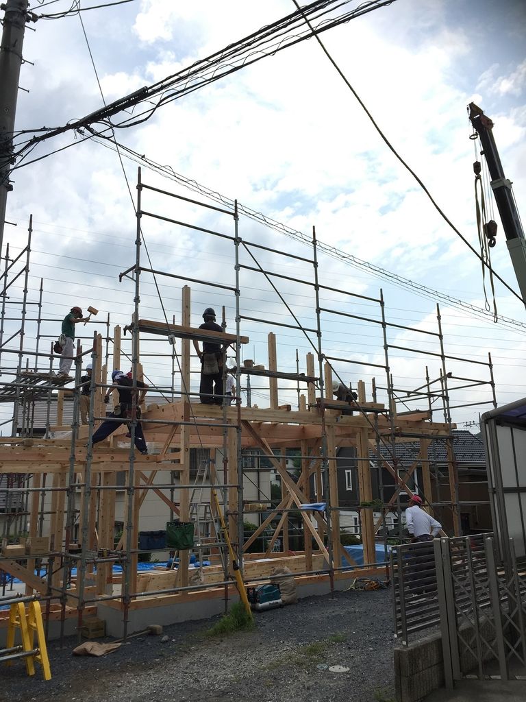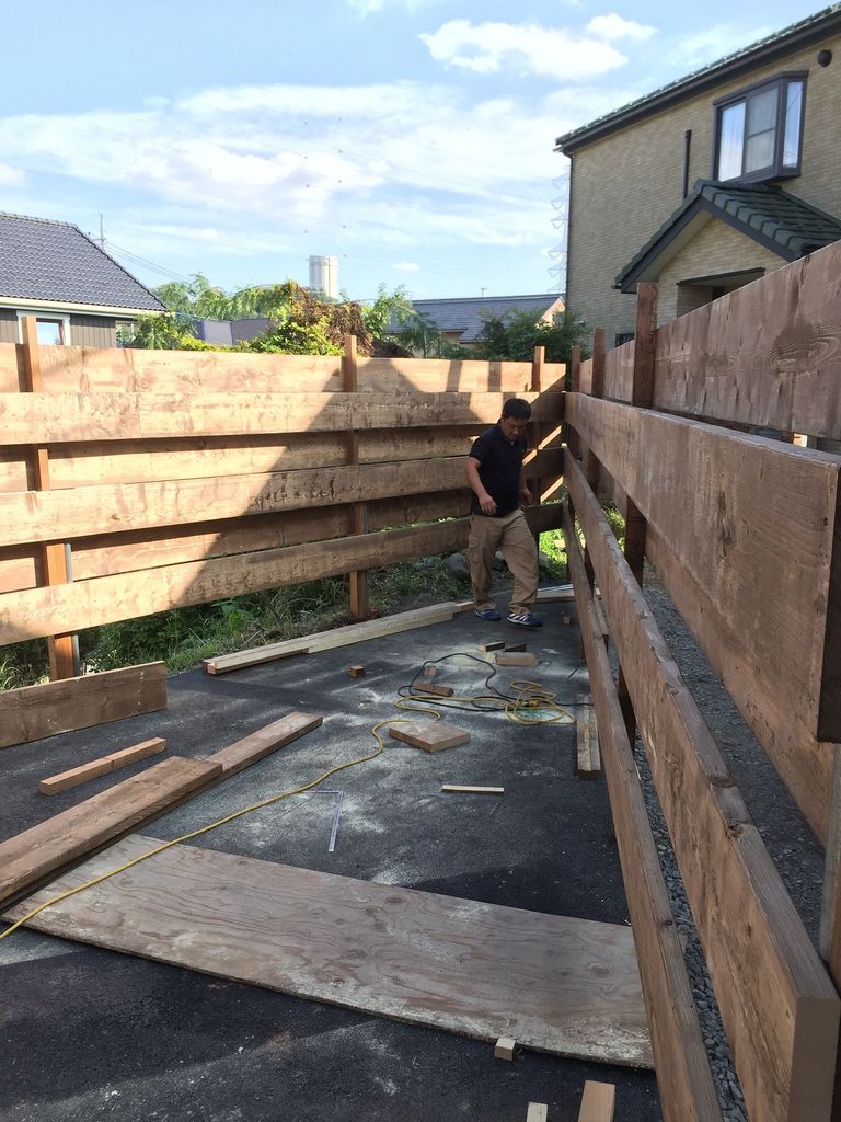 基礎だけでは小さく感じた空間も、柱が建ち屋根が出来るとグッと広がりを感じるようになりました。