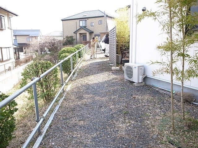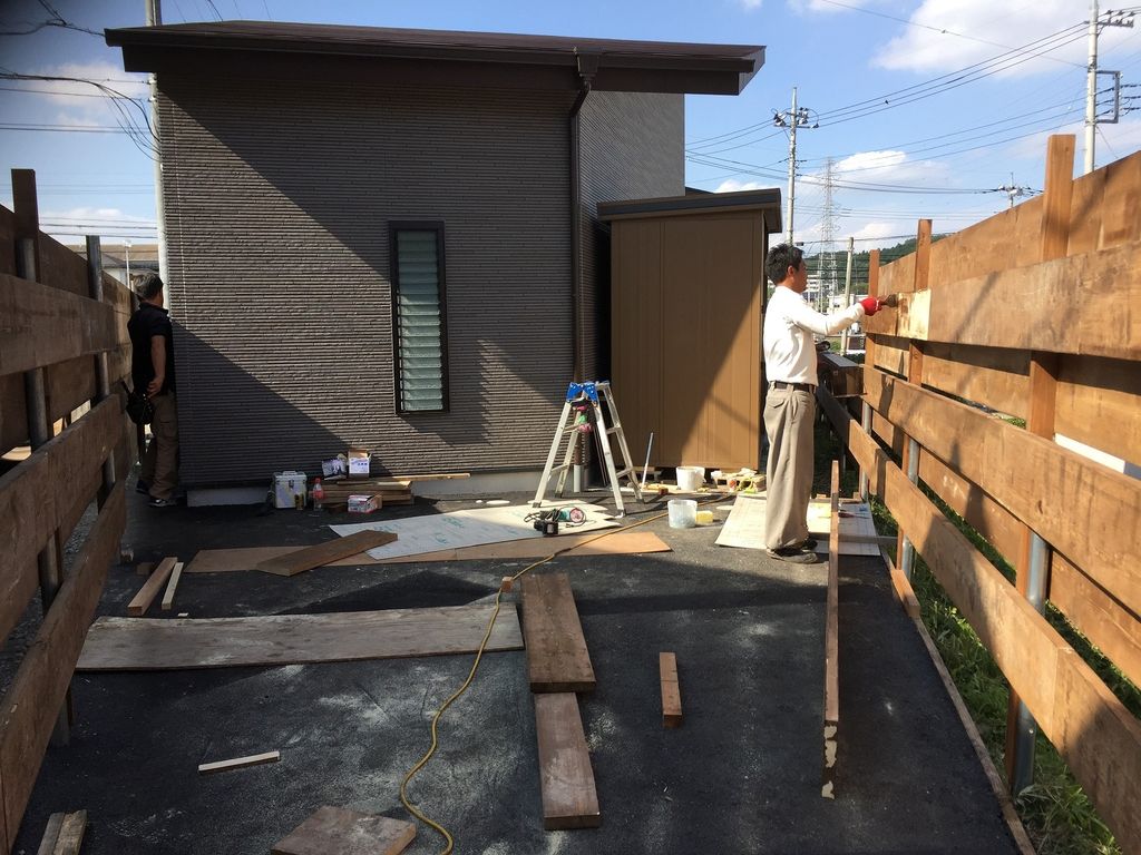 建物は完成に近づき、近隣との目隠しフェンスを工事中