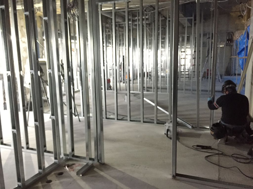 軽量鉄骨で天井や間仕切りを作り、その中に電気配線などを通らせていきます。