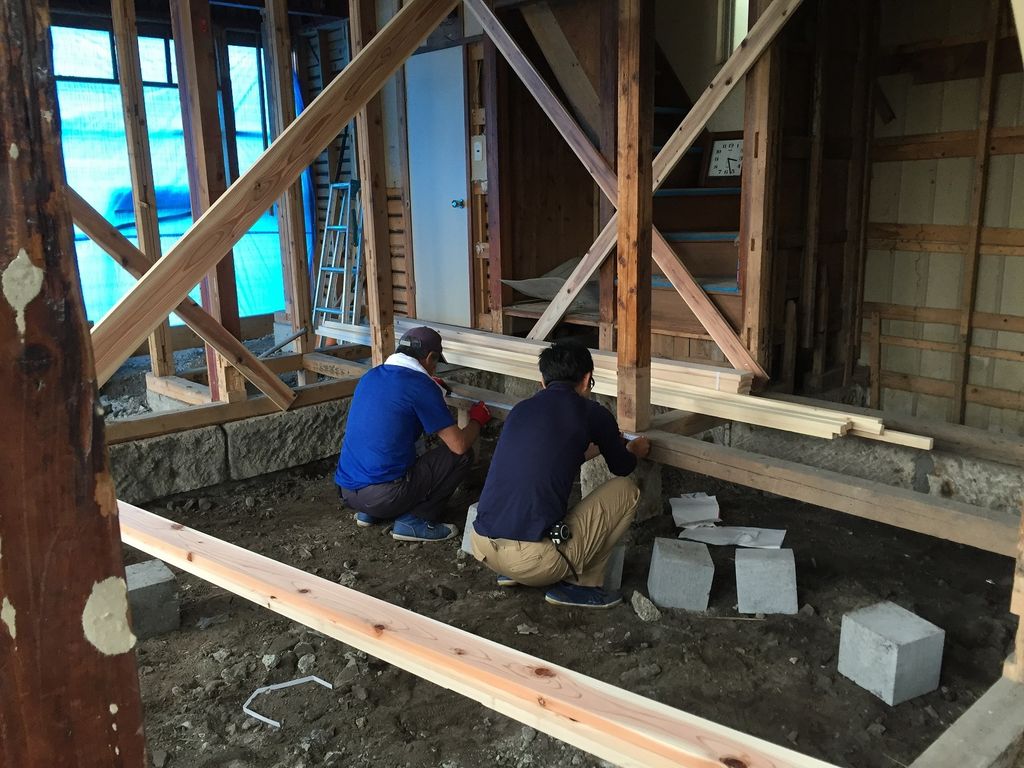 基礎・壁の補強をしっかりと行い、断熱や防水にも注意を払い大工工事が進んでいます。