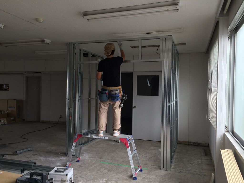 間仕切りや床、看板を設置し完成に向け急ピッチで作業しております。