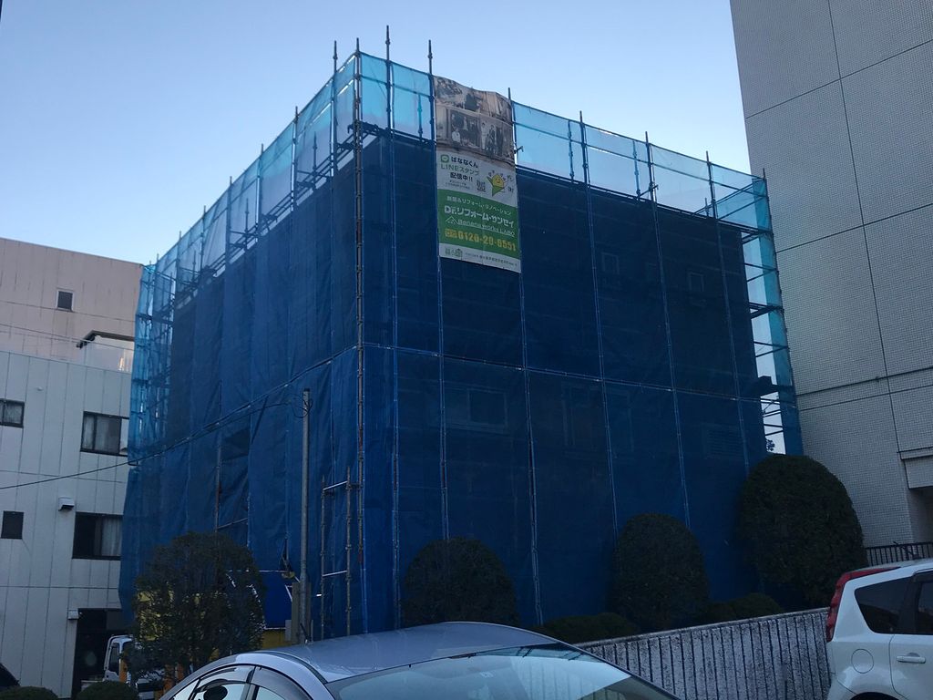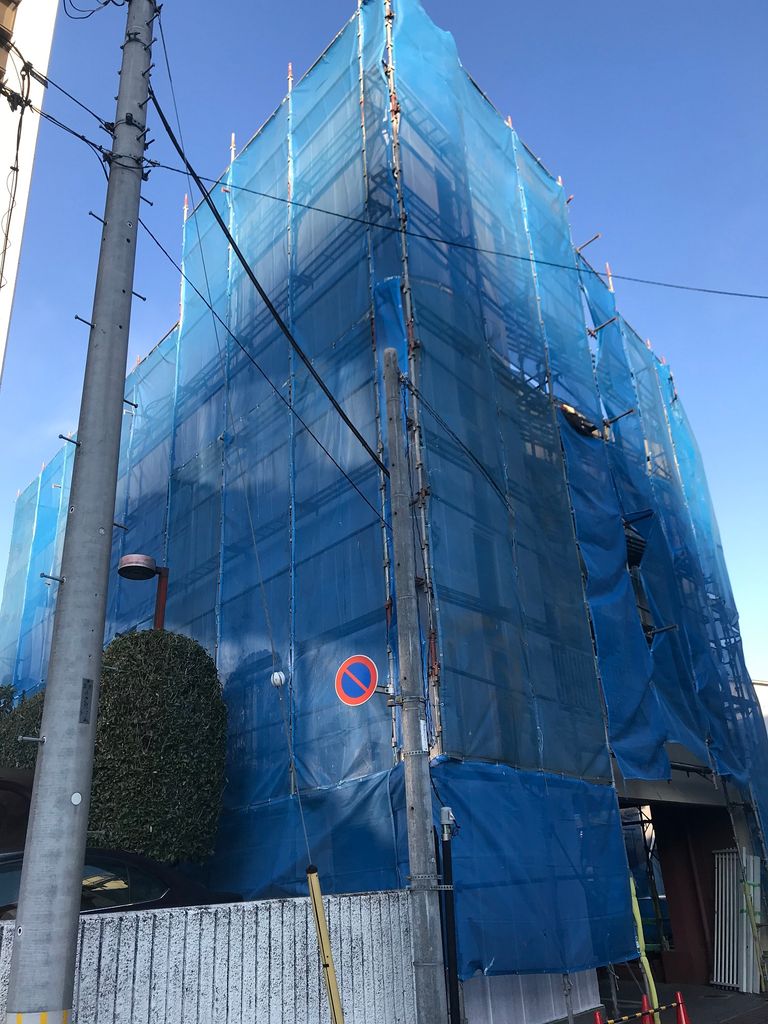 全面にぐるりと足場がかかり、外壁塗装工事が進んでいます。