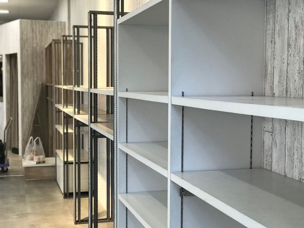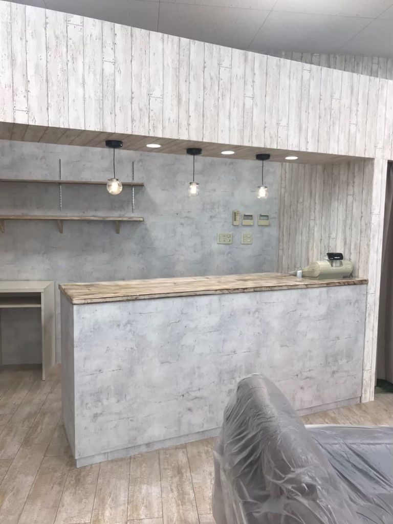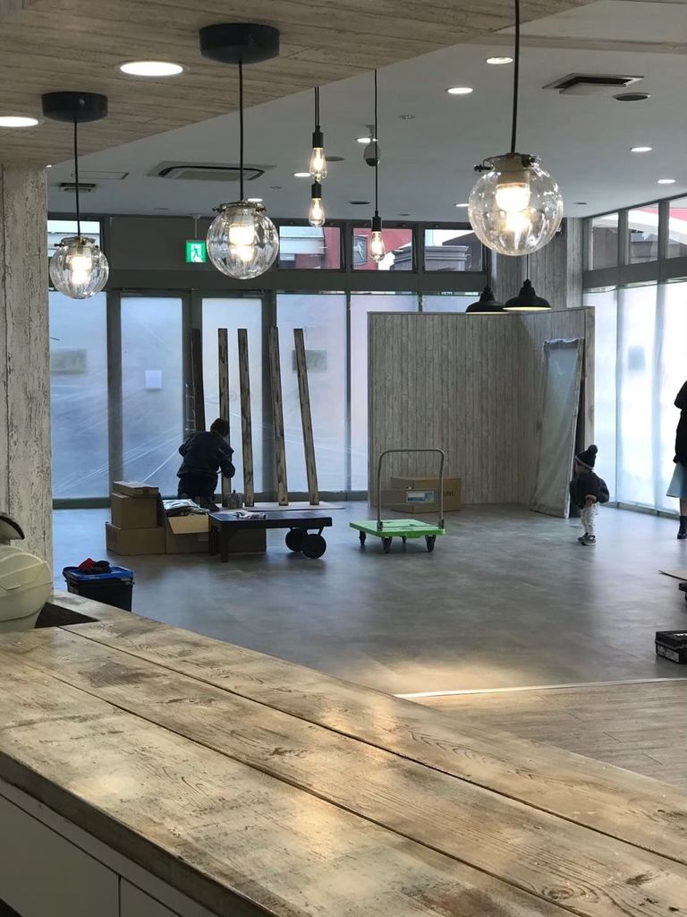 棚の取り付け、カウンターの設置、ビンテージテイストに統一しながら、大工さんと塗装屋さんがショッピングモール内で奮闘中!