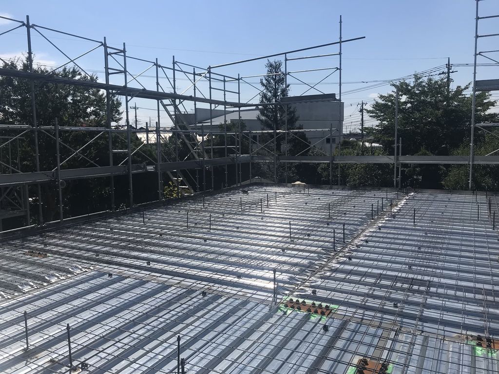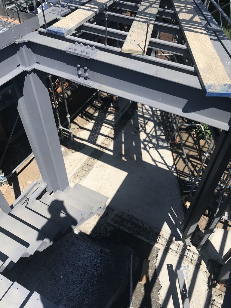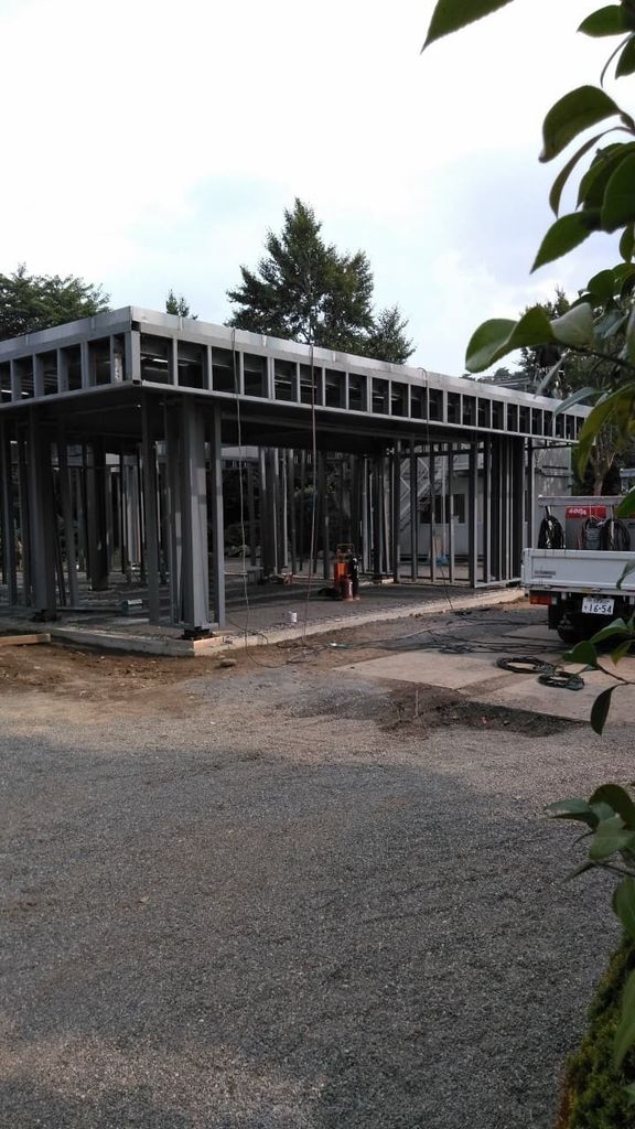 お盆休み前に、新築部分の鉄骨構造体が立ち上がってきました。