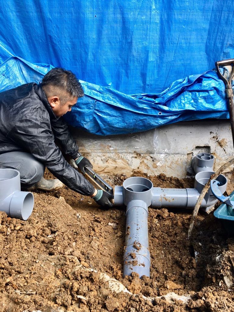 家の外では、トイレやお風呂などの配管工事も進んでいます。