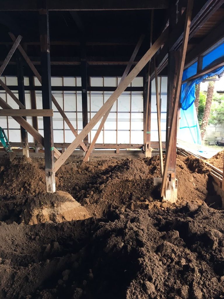 土壁なども取り除き、基礎も造り変えるために一旦骨組みを持ち上げます。