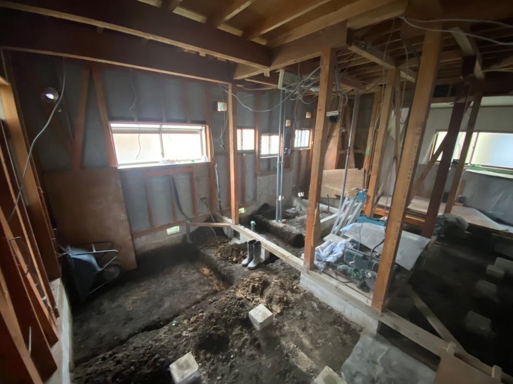 ご覧の通り、一階部分は構造材が丸見えの状態。お客様は、賃貸アパートを短期契約し、お引越ししています。