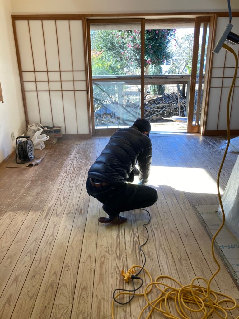 3枚目の写真は、ご主人が床の無垢材に磨きをかけている様子。
