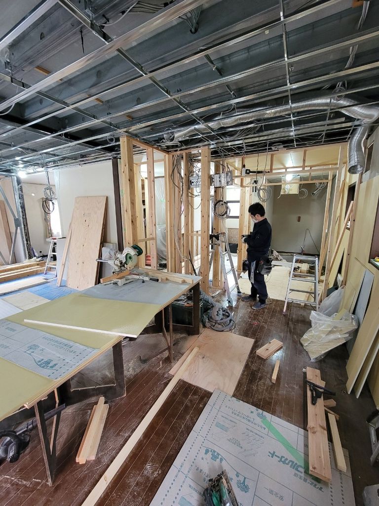 これまでの壁を取り除き、新しい間取りを造るために必要な位置へ、壁を造っていきます。と同時に、電気や水道の位置も新たな位置へ移動して行きます。