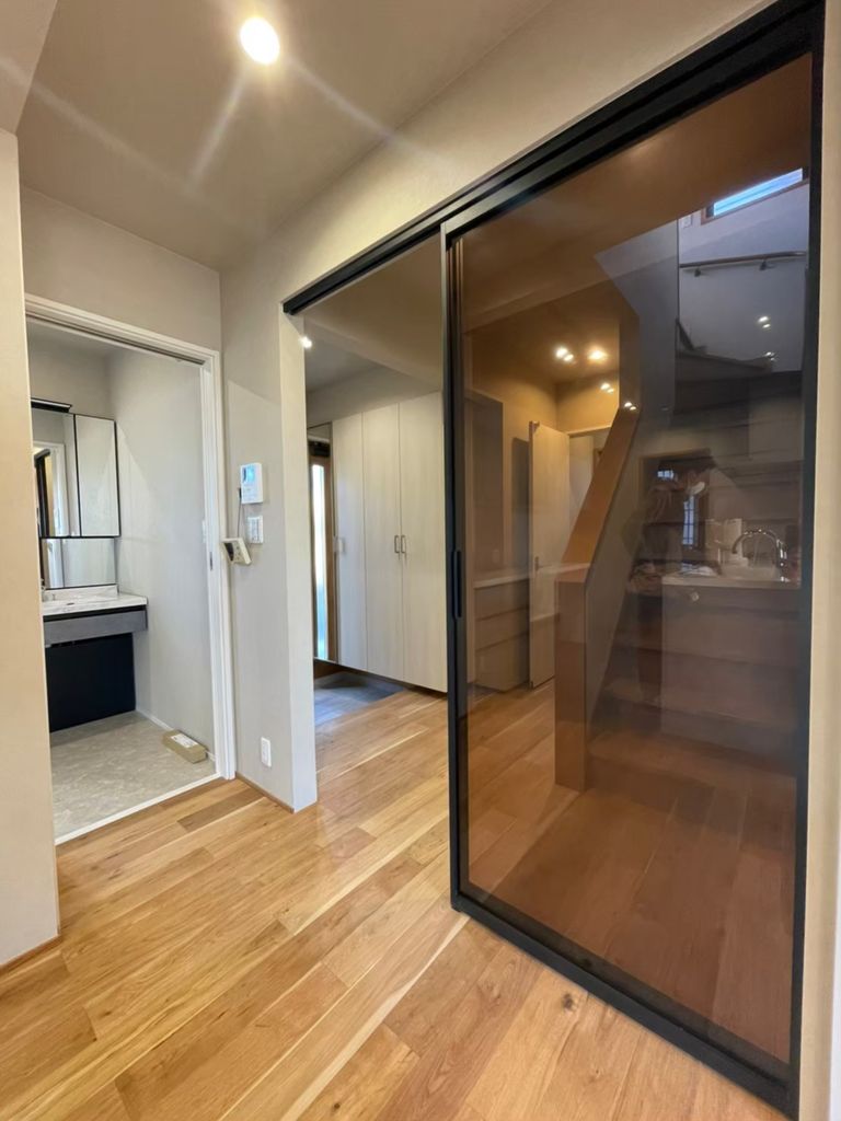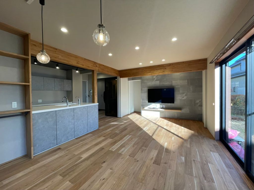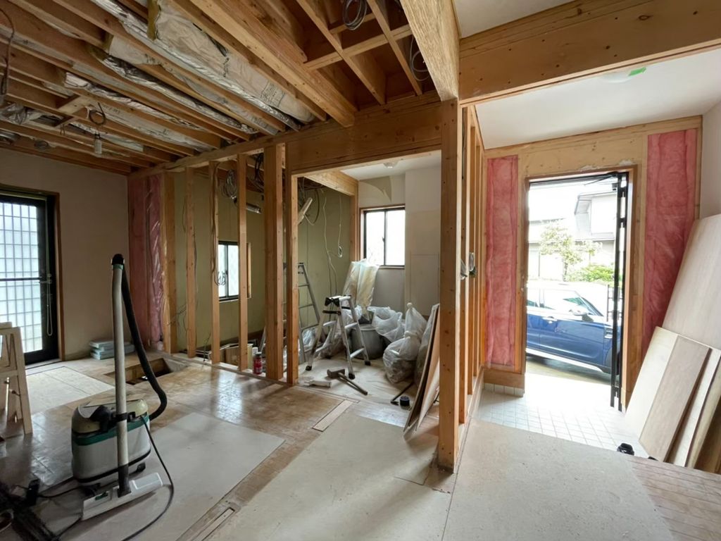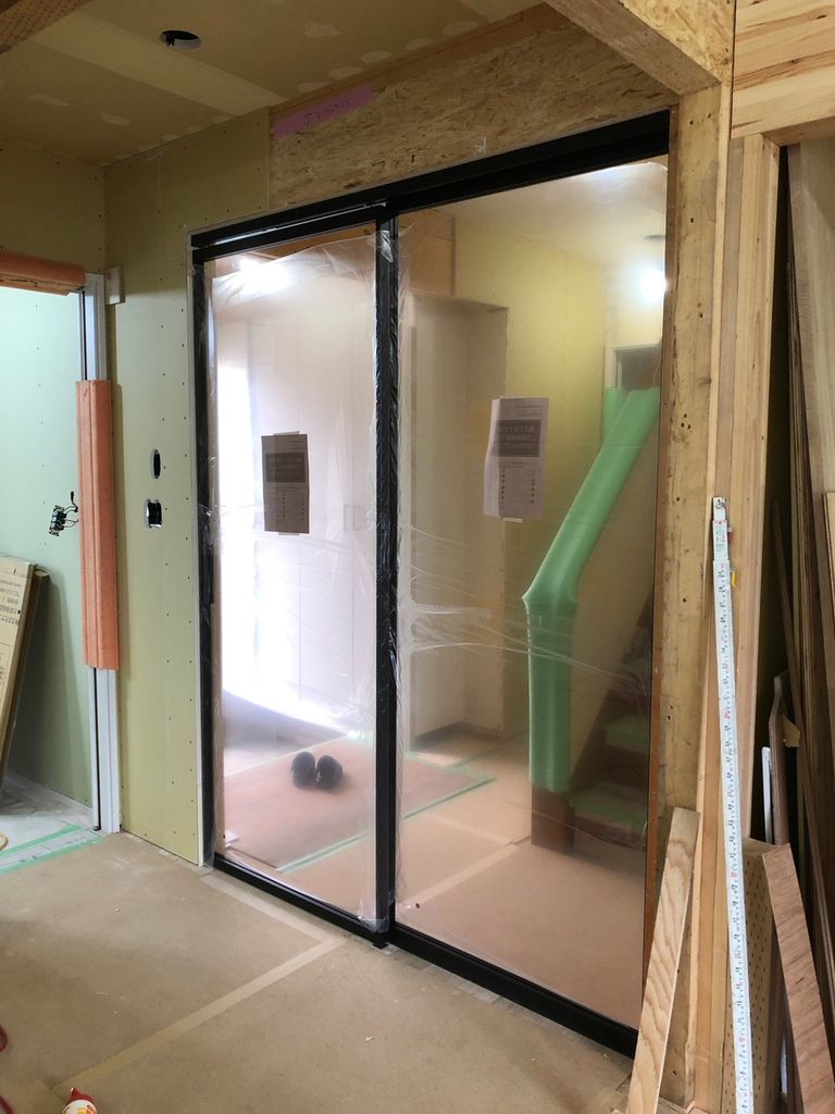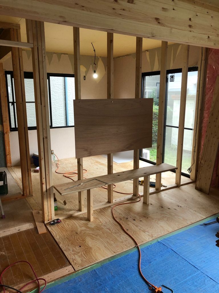 ご夫婦が優先順位NO1に掲げていた、壁を取り払ってのLDK大空間が、姿を現し始めました。暖房効率も考慮して、玄関ホールとLDKの間には透明なパーティションドアも設置。オリジナルTVボードなどなど、ご夫婦と決めてきた特注の品や技が、現場に次々と完成していきます。これまで図面の上でしかお見せ出来ていませんでしたが、より工事の全貌が明らかになり、ツーバイフォー住宅でも、このように間取りを変更できることを実感して頂けている頃かと思います。