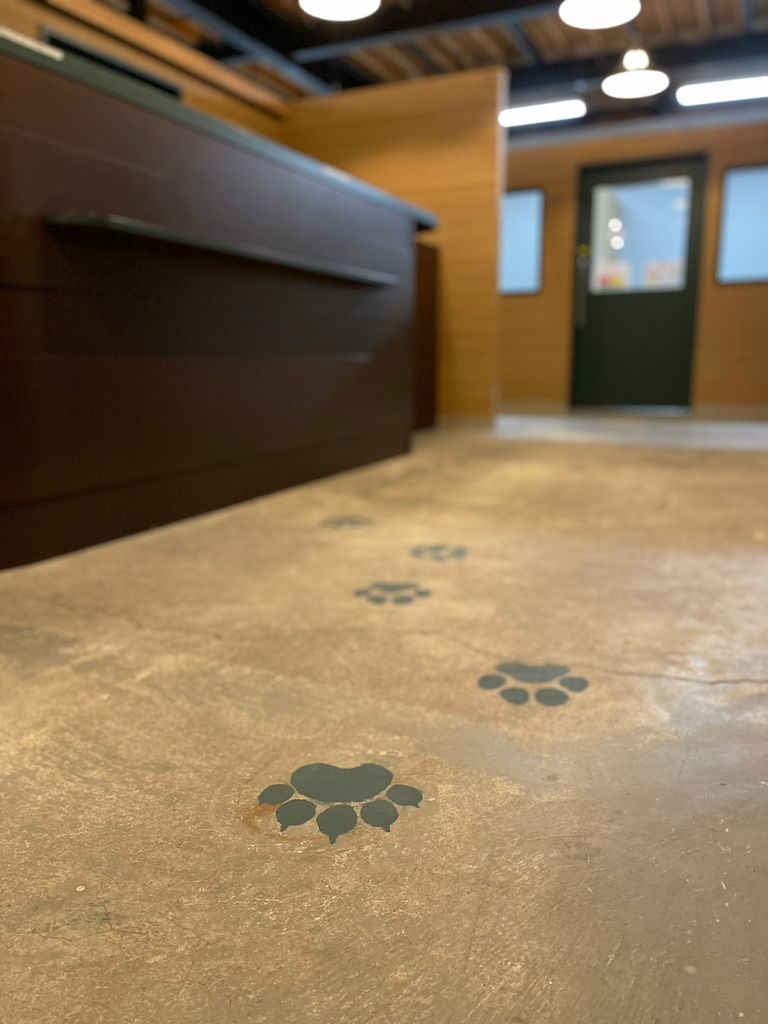 ワンちゃんの足あとは、利用者さんの動線をサポートするアイデアのひとつ。(一か所、クマの足あとが!?バナナワークスラボスタッフからの、愛のこもったいたずらでした♪)