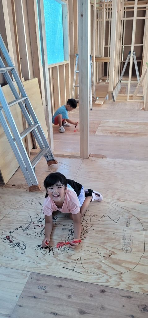 上棟式後、ご家族は建物内を巡りました。将来の暮らしを妄想し、ワクワクと希望に満ちた表情が見受けられました。家族の想いと建物の完成に向けた努力が重なり合い、感動のひとときが訪れました。お孫さんたちは、自分たちの部屋になる所の床材に絵を描き、お父様は家族の家系図を描いていました。