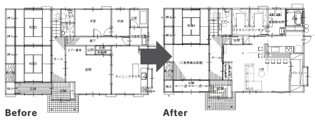 2世帯で暮らす実家をリノベーションして、より快適な家族の絆をさらに深める暮らしへ。対面キッチンや大型ファミリークローゼット、効率的な間取りを取り入れたリノベーション事例をご紹介します。使いやすさと性能を兼ね備えた事例を⾒ることがでるチャンスです。