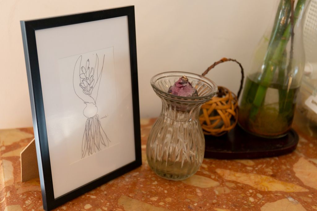 やがて、東京の大学に絵を学ぼうと進学。「私にとって絵を描くことは、自分にあるものを表現、アウトプットすること」と言うように、真紀さんの描く絵は独特。曲線や植物をモチーフに、その時々の心模様を線にのせる。「ピカソが子どもの絵は天才と言っていたが、無心で線に気持ちを乗せる心地よさ。筆が勝手に動く境地がたまらない」と。大学時代の恩師が「天真爛漫だからいい絵が描ける」と評してくれたことを嬉しそうに語る。そんな気持ちが、ART
