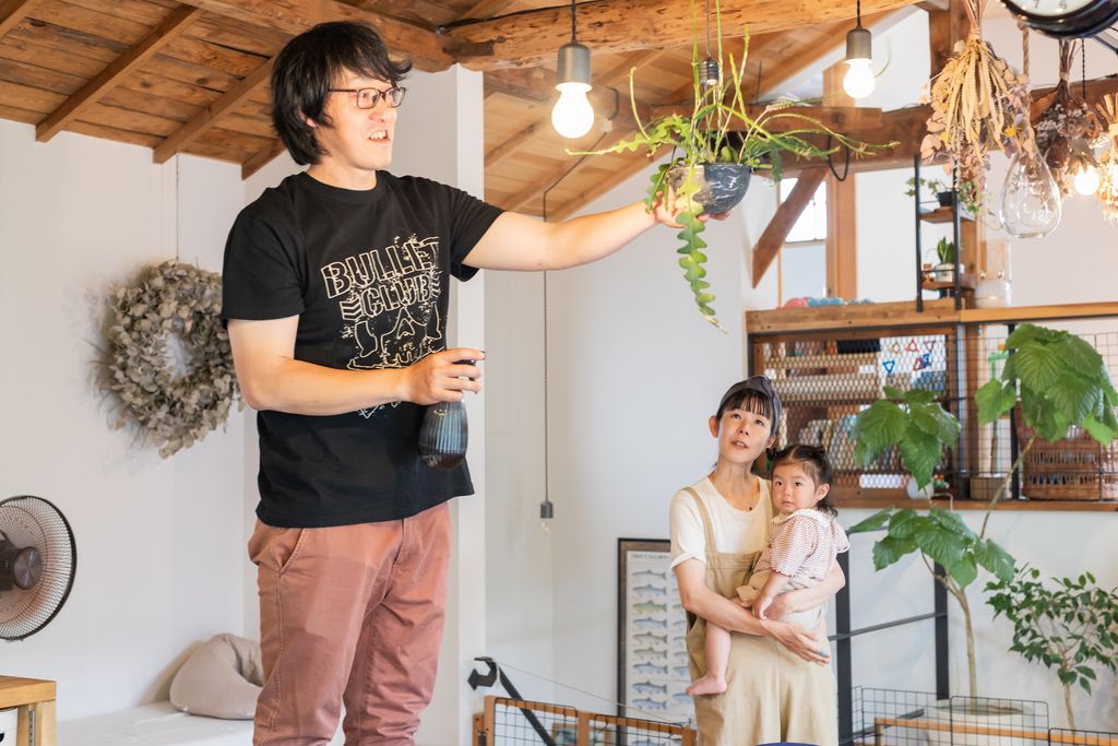 かつては祖父母が店舗兼住まいとして暮らしていた築58年の空き家を譲り受け、4年前にリノベーション。基本的な構造はプロの手によるが、スキップフロアの最上階の床やシューズクローク、キッチンの食器棚などインテリアの一部は健太さんのDIY。今でも緑さんが「ここに〇〇があったらいいな」とつぶやくと、いつの間にか出来上がっている。ほの花ちゃんが歩きだすと、転落防止柵が出現する。そうやって、その時々の生活に必要なものは、健太さんの手で整えられている。