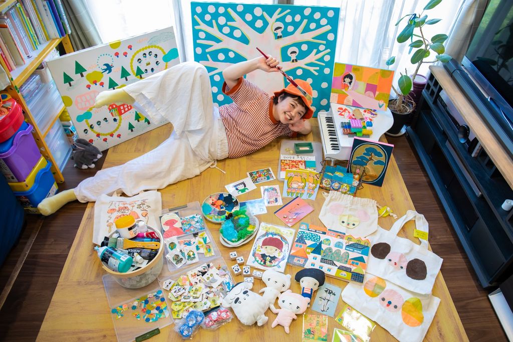 仕事、子育て、主婦業の傍ら、インスピレーションがわくとコツコツと作品にまとめ、個展を開いたりイベントに出店したり。アクセサリーや雑貨、Tシャツ、トートバック、スタンプ、包装紙、カレンダーなど、イラストを画くだけではなく自らの手仕事で仕上げてしまう。だからこそ、すべて1点もので、どれひとつとして同じものがない。