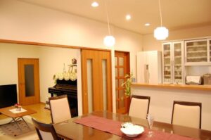 これまでは北側に約8畳のダイニングキッチンがあり、その南に同じく8畳のリビングがありましたが、キッチンを思い切って約半分のスペースにして対面式とし、空いた残りの半分をパントリー(食品庫)にしました。今までのダイニングキッチンとリビング、そして客間の三つの空間は、大きなリビングダイニングキッチン一室となりました。それによって、同じ時間を、同じ空間で、そこにいる全員が共に過ごすことができるようになります。また、キッチンとダイニング、そしてリビングをそれぞれ適度に仕切ることで大空間に落ち着きが生まれると同時に、必要に応じて冷暖房の効率も向上します。