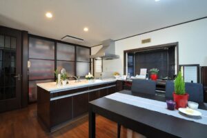 ・フルオープンのキッチンは使い勝手が良く、収納たっぷり。家族やお客様との会話もスムーズにできる。