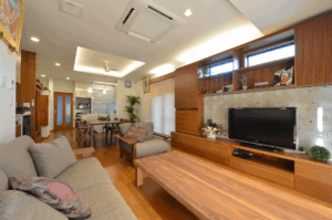 冷蔵庫や神棚、仏壇、TVなど全て造作で収納してあるので、すっきりとした空間になっている。バリアフリーの床には床暖房。床下もしっかり防水シートと断熱材で補強し、冬暖かく夏涼しい快適空間に仕上がっている。