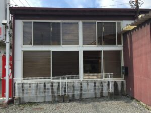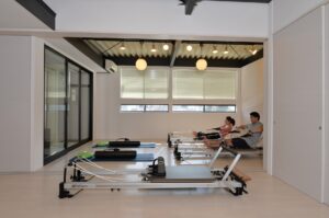倉庫だったところをピラティス専用スタジオにリフォーム。外から見ると、白いエリアがヨガスタジオ、黒いエリアがピラティススタジオ。入口を入ると真ん中でセパレートされている。
