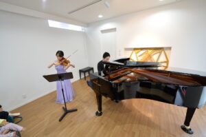 (写真:完成記念に、“100万人のクラシックライブ”で約40人をおもてなし。気軽に普段着でクラシックに親しむことができ、みんなにとってもメモリアルな一日となった。ドクターリフォームサンセイ代表の一級建築士