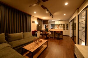 1階は、洋室と和室2間と廊下の間仕切りをとりはらい1ルーム