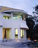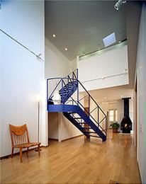 まず、外観をひときわ印象的にしている円形の屋根。個性をさりげなく表現しています。さらに、その屋根の下に位置するリビングは、四季おりおりの借景が楽しめる絶好の憩いの空間となっています。そして、高い吹き抜けと鮮やかなブルーの階段、それと対比するかのようにしつらえられた暖炉。色や素材のバランスに細心の注意がはらわれています。階段で使われたブルーは、換気口など、他の部分にも流用されています。一転、浴室はアースカラーでまとめられ、簡素な印象ですが、猫脚のバスタブなど、設備のセレクションも洗練されています。明るくポジティブな住まいです。