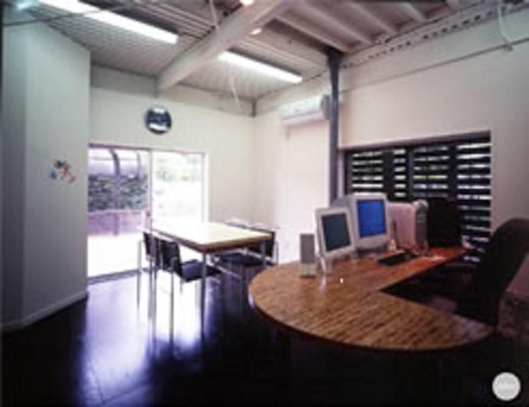 それまで自宅の離れを映像制作用のオフィスとして使用していましたが、かなり老朽化している上に、トイレも水廻りもなく、スペース効率も悪く雑然としていました。そこで、スタッフが加入したことをきっかけに仕事場の環境を良くしようと思い立ち、リフォームを決意しました。当初の要望は、1階にトイレを作る、1階と2階を仕事場兼応接間にする、外壁が崩れているので外観を整える、コンピュータの配線を整理するなどでしたが、いずれも難なく解決しました。特に外観は、木製のルーバーとガルバニウム合板の組み合わせが斬新で、インパクトのあるオフィスの外観へと変身してしまったのです。