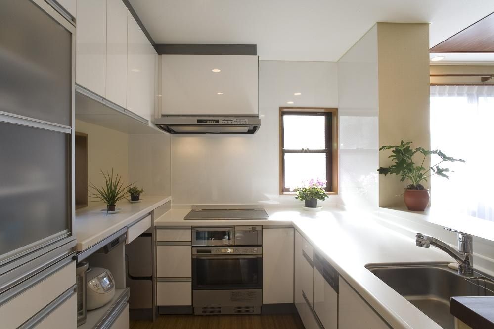 キッチンは対面型にレイアウトして、孤独感を全く感じさせなくなりました。また光・風が抜けるように考慮し、隣には棚付きの食品庫を設け、大容量の収納が可能に。「今まで暗いキッチンで作っていたので、明るく会話をしながら料理を楽しみたい」「見える場所にはあまり物を置きたくない」という奥様の声は、これで解消されました。