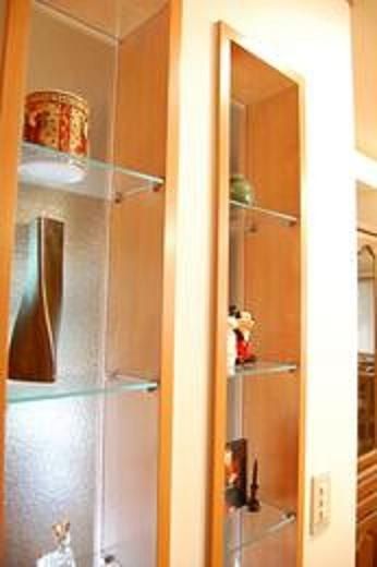 ダイニングは、納まりきらない食器を収納する為に買い揃えた家具で、圧迫された空間となっていました。そこで、ダイニングとキッチンを仕切っていた壁をなくし、広く見せる工夫をしました。また、これを気にお気に入りの家具を壁に埋め込み、出っ張りをなくした。それによって、家具を置くと感じる独特の圧迫感を抑えてすっきりとした空間が生まれました。2階の給排水の配管が通っているパイプスペースがあったことと、抜けない柱があったため、逆にそれを生かして飾り棚も設けました。背面には曲線の彫りがデザインされている木製の壁材を使用して、空間にアクセントを持たせました。小物が好きな奥様は、楽しんでディスプレイをして下さっているそうです。
