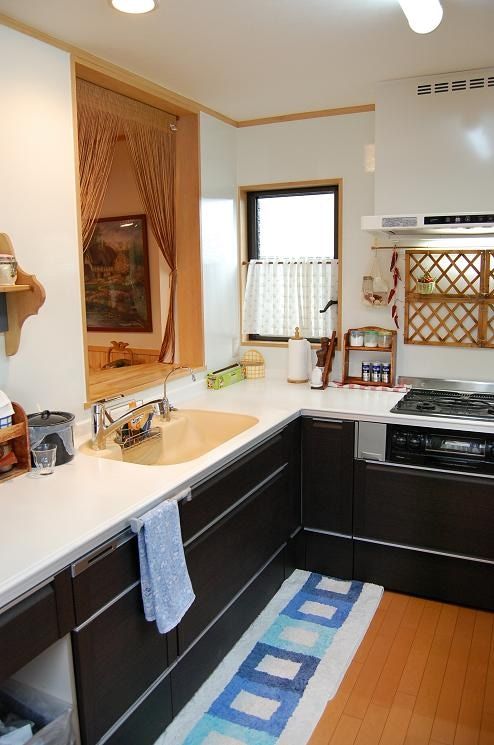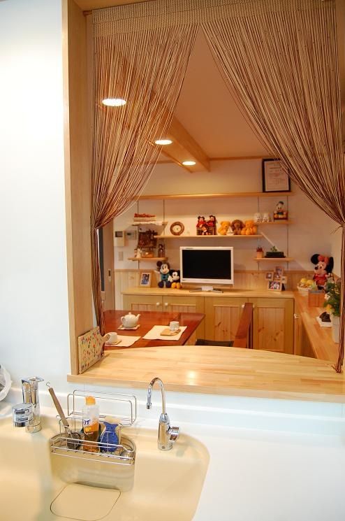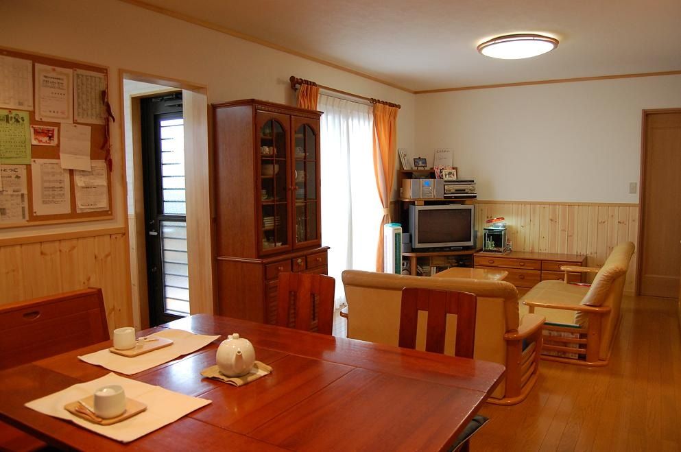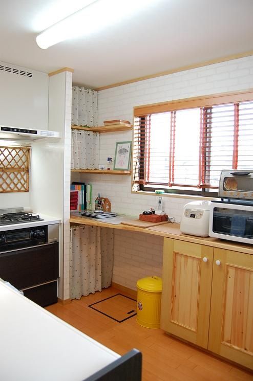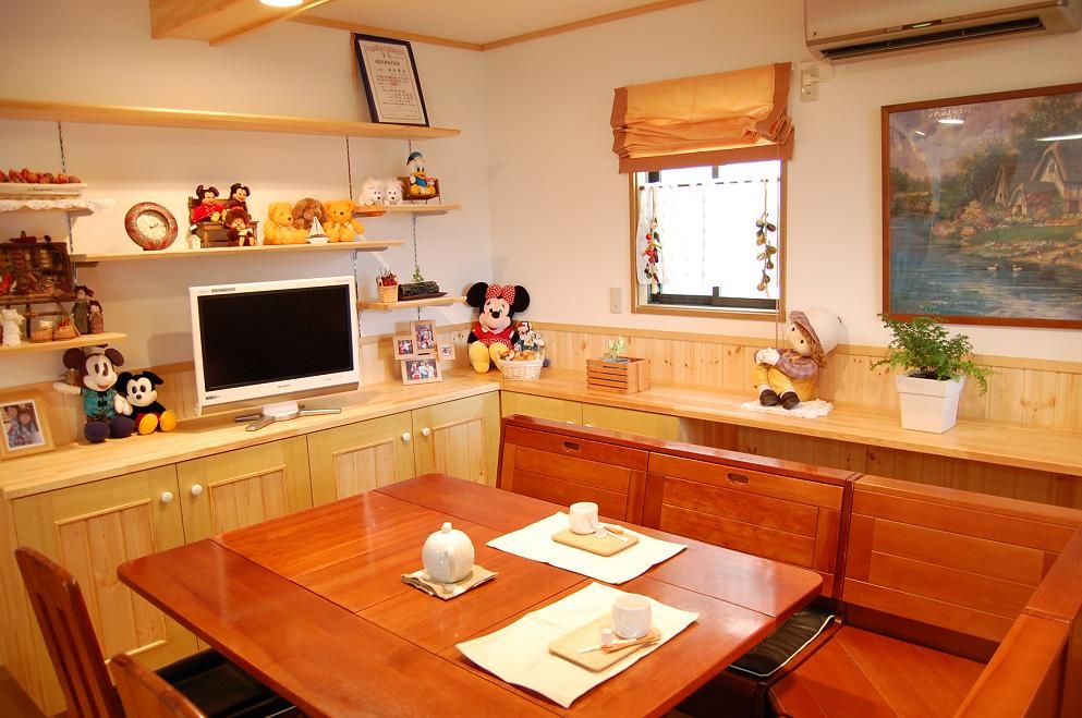 奥様の好みのインテリアを反映させ収納するものにあわせたカントリー調の収納を設けました。2×4(ツーバイフォー)住宅であったため、構造に手を入れることが限られるつくりではありましたが、LDKに一体感が生まれるような間取りをご提案しました。