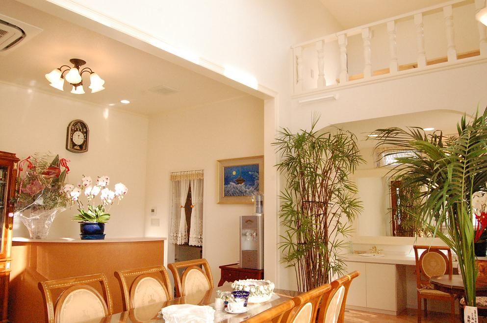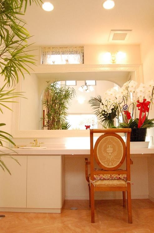 自宅にあった大きな倉庫の一角をリフォームして、南側を一部増築をしてサロンのスペースとしました。室内は、美と上品さ溢れるラグジュアリーな空間づくりを目指しました。家具も新たに買い調え、統一感のあるヨーロピアンな印象を感じさせます。当初、決して広い敷地ではないと田中さんは感じていたそうですが、天井を高くし、一部にロフトを設けたことで、広がりを感じる開放感のある空間となりました。ホテルのような、ゆったりとしたメイクスペースに設けられた大きな鏡が、より一層奥行きを演出します。