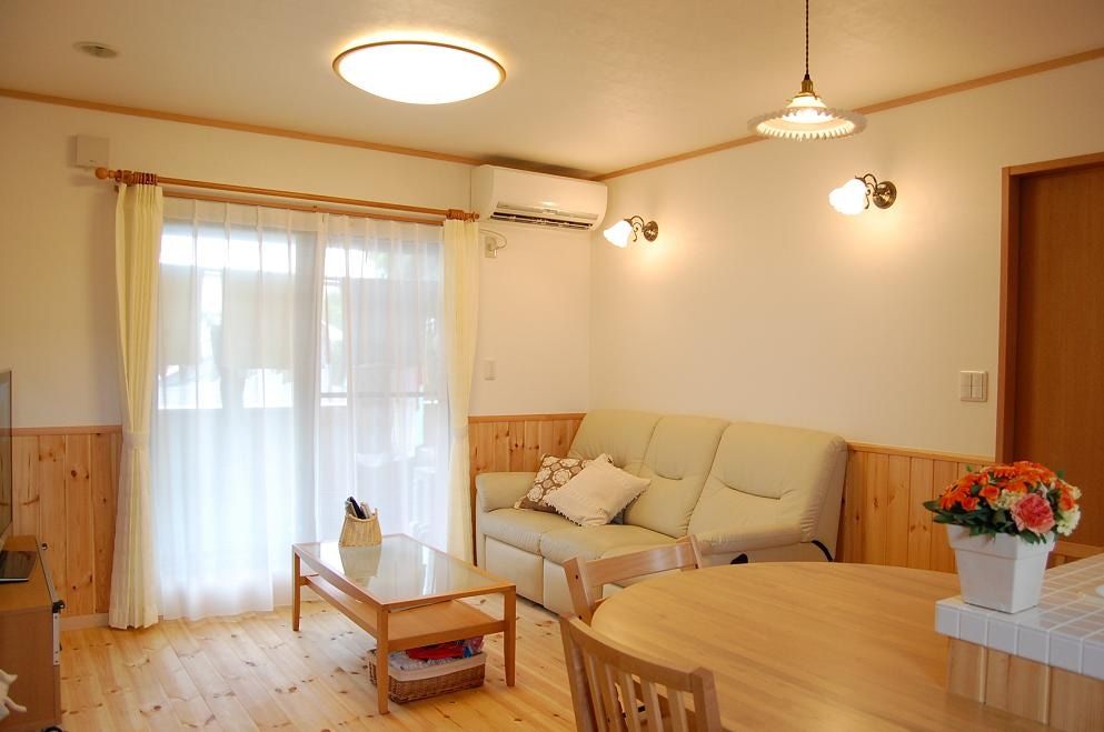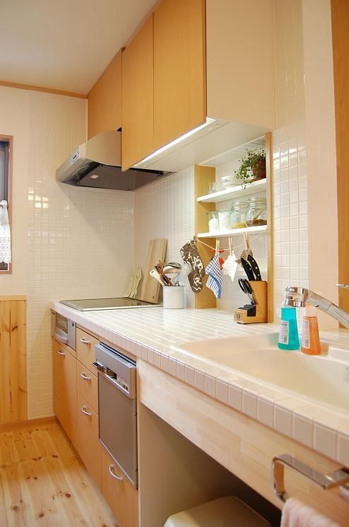 リフォーム前の自宅には8畳の部屋が2つあり、この2階部分に、新たにご家族の生活スペースを設けることが今回のリフォームの中心です。ここに、ご夫婦の寝室、家族がくつろぐLDK、洗面室、トイレ、そして将来のお子さんのお部屋を新しく設けるため、二階部分を増築してスペースを確保することになりました。全体は、奥様のお気に入りのカントリースタイルで、あたたかなイメージの空間づくりをコンセプトとしました。キッチンは奥様の大のお気に入り。真っ白なタイルが貼られた爽やかなキッチンは、システムキッチンではなく、大工さんの手仕事により完成した奥様だけの特別なキッチンです。