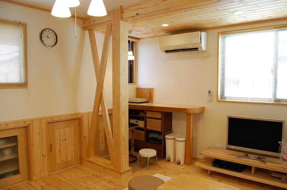 要望のあった子ども部屋は二階の一室に配置し、一部を増築して実現したLDKにミニキッチンを設けました。以前の和室は洋室になり、ご夫婦の寝室となりました。家族がくつろぐLDKは、「素足で気持ちよい家」にしたいというご夫婦の要望のもと、無垢材が床と腰壁にしつらえられ、何とも自然の雰囲気が心地よい温かみのある空間に仕上がりました。LDKの一角には、レザークラフトが趣味のご主人のための工房とも言うべき作業スペースも出来上がっています。ここのカウンターには、ご主人のお母様の実家に生えていたという、大きな公孫樹の一枚板をしつらえました。「昔、この木のぎんなんをよく祖父と一緒に拾ったんです」とご主人。