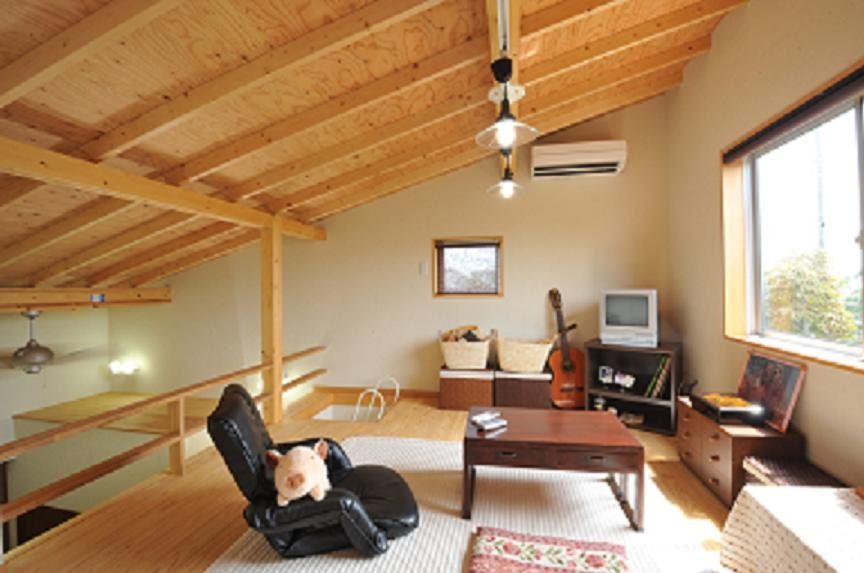 屋根の片側だけ大きく傾斜させ、2階をロフトにした減築リフォーム。中廊下で南北に区切られていたスペースをつなげ、広々とした空間を創り出した。