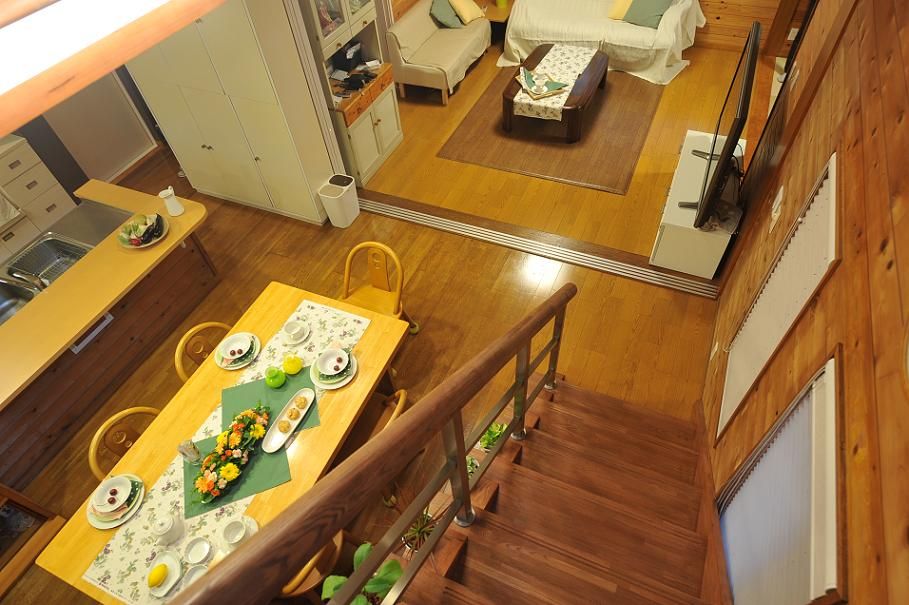 玄関を広くするために階段を取り除き、その場所を1階はトイレ、2階は納戸として利用。新しい階段をダイニングの吹き抜け部分に取り付けたことで、新鮮な空間が生まれた。