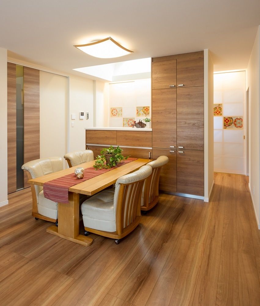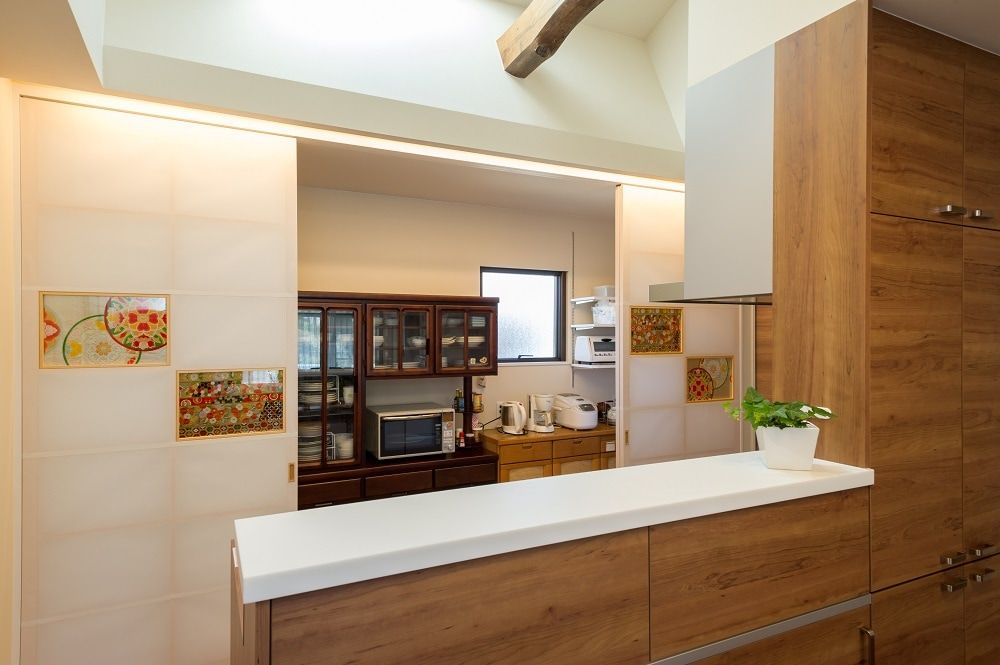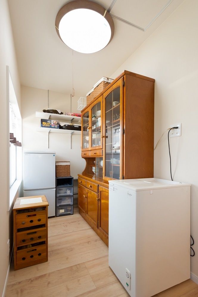 また来客時は閉めて生活環を隠すことができます。勝手口横には食品庫を設け、既存の食器棚や冷凍庫などを置いて頂けます。