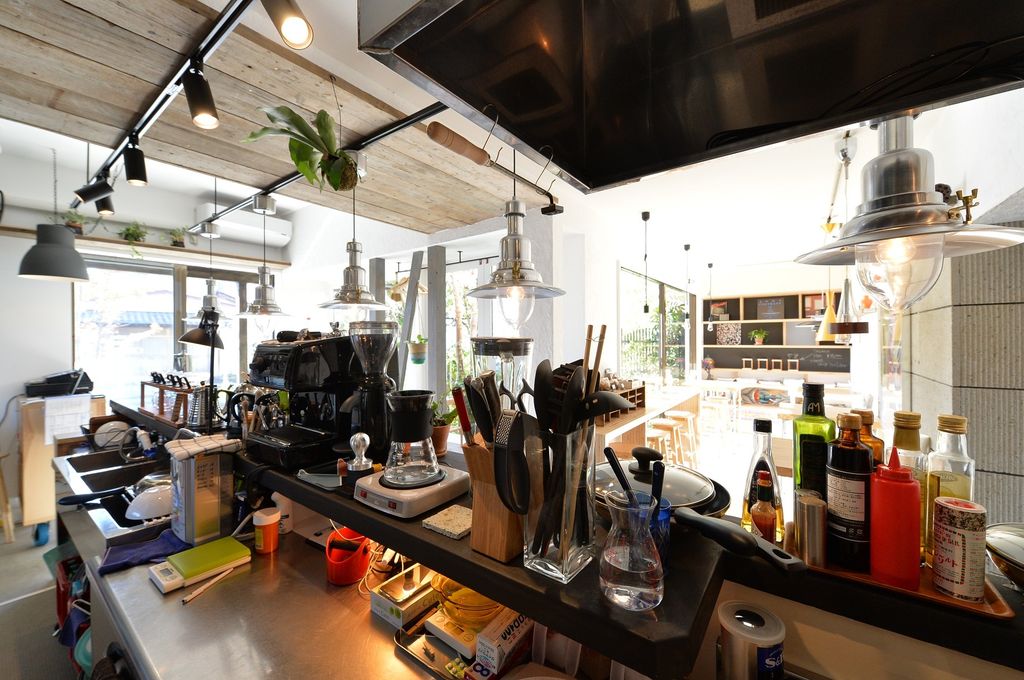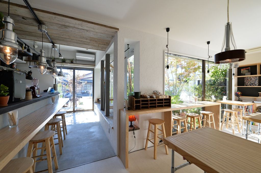 植物と空間のデザイン融合をコンセプトに既存の店舗を一部増築して完成させた足場板や、タイル・黒板、ガス管とバルブ、大谷石など質感も用途も違う素材をテーブルや椅子・棚に利用することで、さまざまな植物とも相性の良い空間となった。