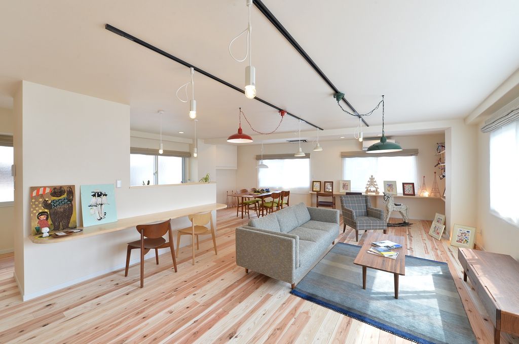 2階 東側には家族みんながゆっくり寛げる24畳の共有リビングをプラン。杉の無垢材が気持ち良い。