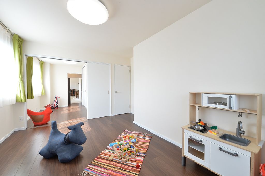 3階 若世帯スペース。東側は子供部屋と主寝室。今はプレイルームとして開放してあるが、将来は子供部屋2部屋に間仕切りOK。コンパクトにまとめたサブキッチンもあって、忙しいママには大助かり。