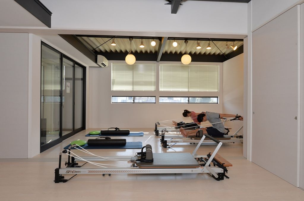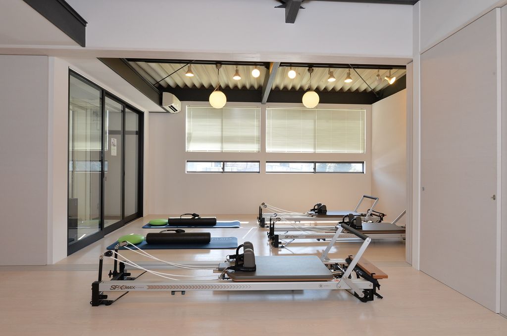 このスペースで行われるピラティスは、マットとマシーンを使用した2タイプの運動に分かれるため、2つクラスを同時に開催する際は、間仕切りを閉めセパレート空間に。